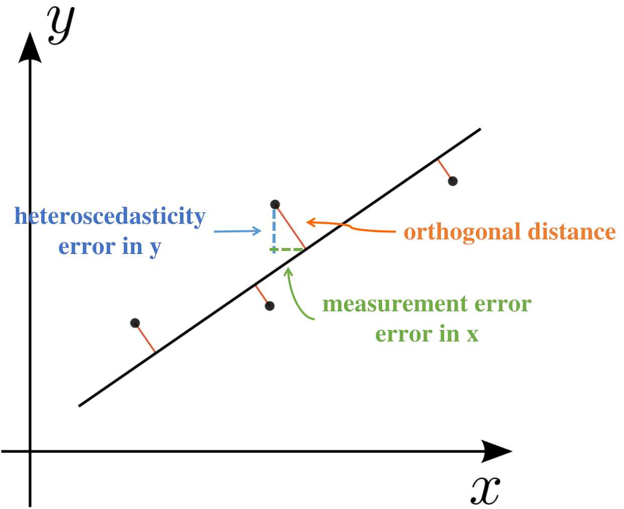 In the frequentist framework, accounting for measurement error in the independent variable X leads to nontrivial models. One commonly used solution is Deming regression, which assumes known variances in both X and Y and minimizes orthogonal distances rather than vertical residuals.